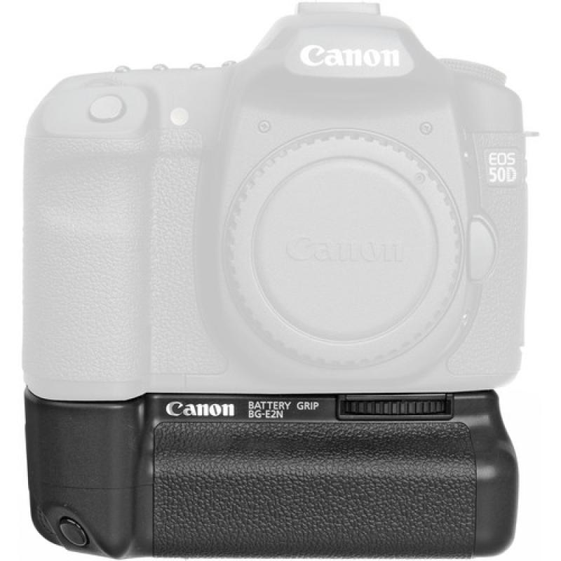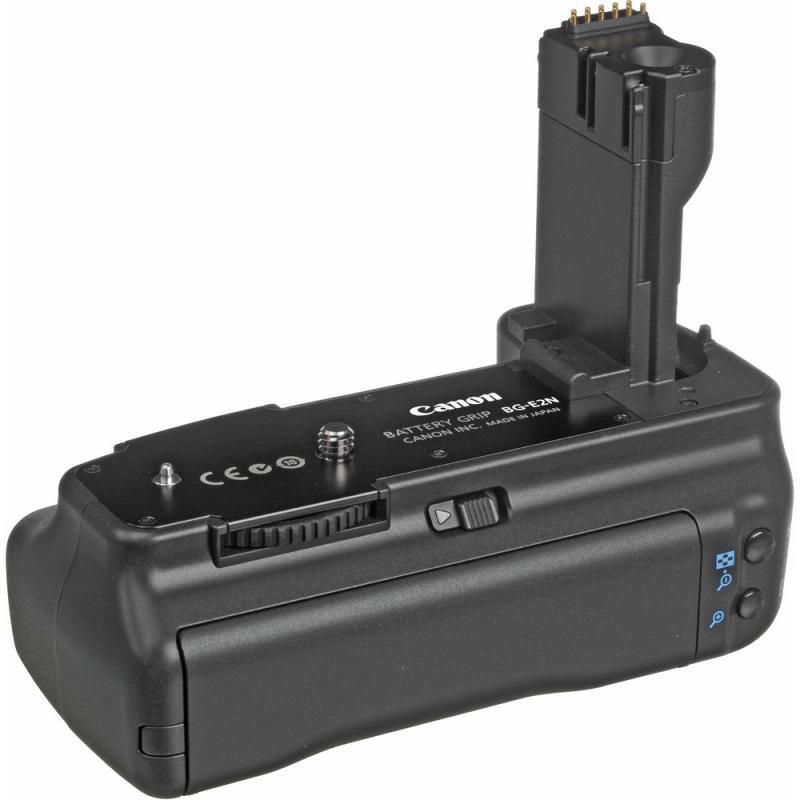 O suporte vertical/bateria BG-E2N da Canon adiciona uma liberação vertical do obturador e é compatível com até duas baterias de íons de lítio BP-511, 511A, 512 ou 514 ou seis baterias AA com o suporte de bateria BGM-E2 incluído. O BG-E2N fornece uma liberação adicional do obturador, mostrador principal, trava AE/trava FE e controles de seleção de ponto AF para facilitar o disparo vertical, bem como uma rosca de montagem em tripé de tamanho 1/4-20.