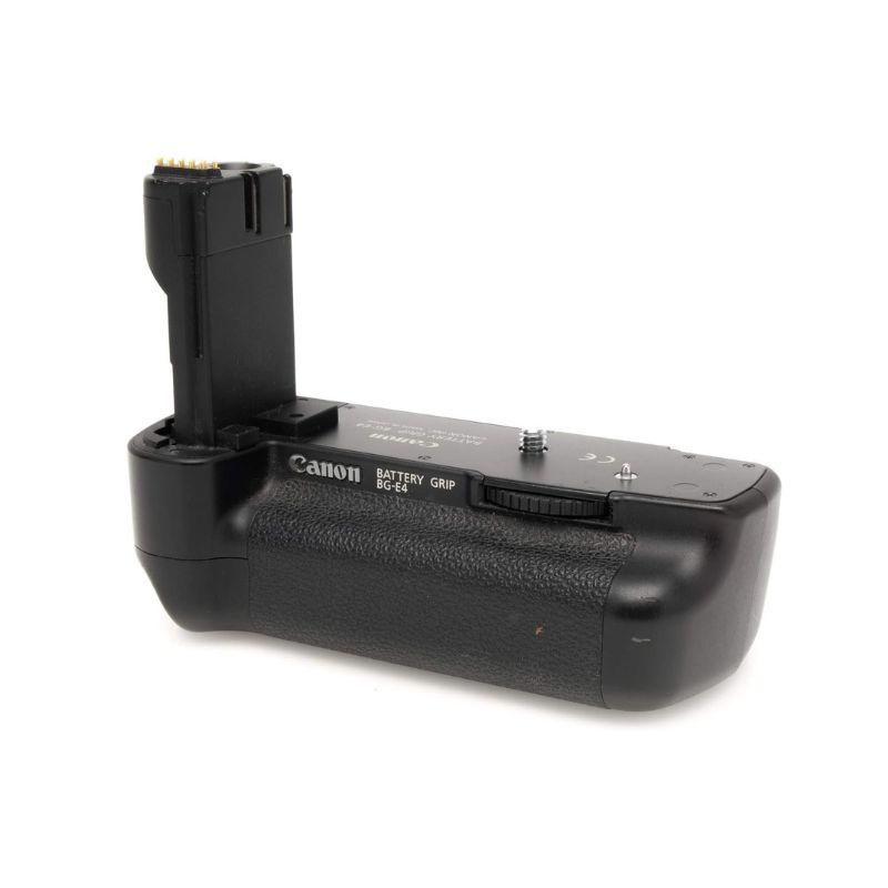 O grip de bateria Canon BG-E4 para a câmera digital SLR EOS 5D adiciona um disparador de obturador vertical a uma câmera já robusta. Este grip é compatível com até duas baterias BP-511A da Canon ou, alternativamente, um conjunto de seis baterias tamanho AA, para maior capacidade de fotografia e maior comodidade em viagens. Além disso, possui um botão de bloqueio AE/FE, seletor de ponto AF e um dial principal para permitir o uso confortável da câmera quando segurada verticalmente.