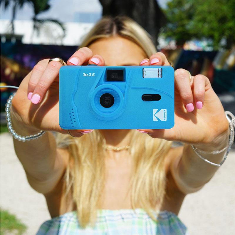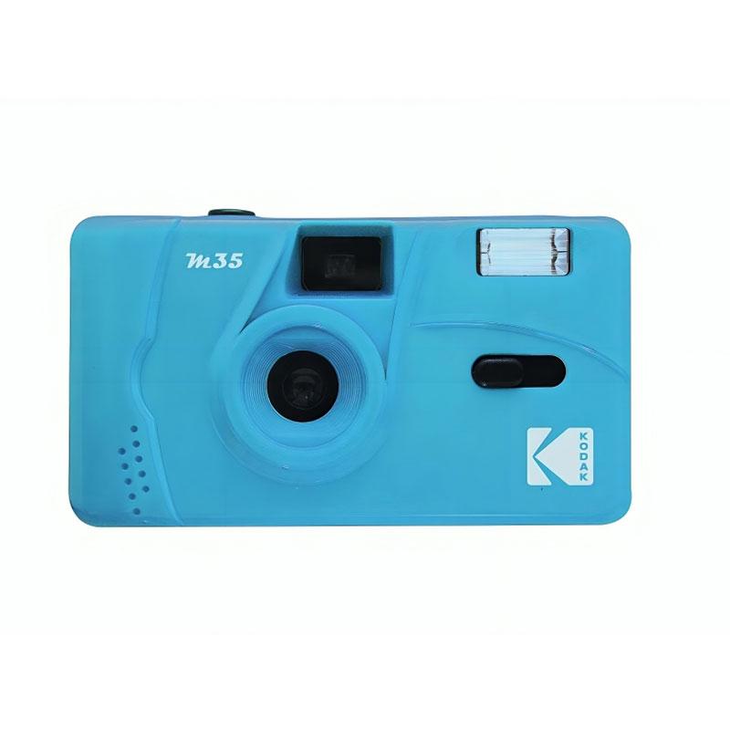 A Câmera de Filme Kodak M35 com Flash é uma pequena câmera reutilizável que usa filme de 35 mm. Esta câmera possui uma lente de foco fixo de 31 mm, enrolamento e rebobinamento manual de filme e um flash embutido com botão liga/desliga.