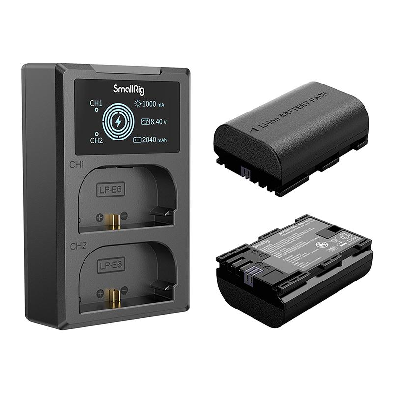 O kit de bateria e carregador de câmera SmallRig LP-E6NH 3821 inclui duas baterias e um carregador. A bateria, equipada com um chip de decodificação completo, suporta câmeras variadas perfeitamente sem causar janelas pop-up e possui ABS à prova de fogo de qualidade e revestimento de PC fosco para garantir toque fino e durabilidade.
