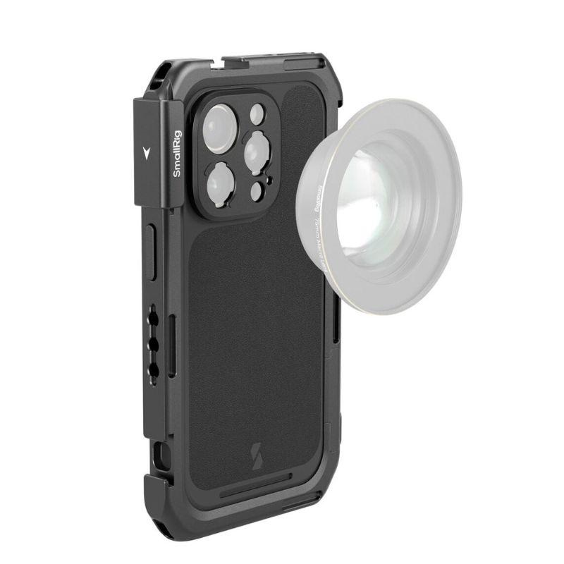 O kit de tripé duplo para iPhone 16 Pro da SmallRig facilita a gravação de vídeos, transmissões ao vivo e filmagens com qualidade profissional usando o iPhone 16 Pro. Este kit inclui uma capa para celular, um suporte para vídeo, uma alça lateral com controle sem fio, uma alça lateral giratória e uma estrutura macia de TPU. O suporte para smartphone oferece diversas opções de montagem para microfones, luzes de LED e outros acessórios.
