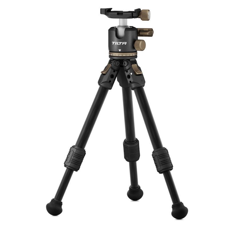 O tripé de mesa de fibra de carbono BT03 da Tilta com cabeça esférica, cinza espacial, é uma opção de suporte durável e compacta para criadores e fotógrafos que viajam com câmeras e configurações de menos de 3 kg.